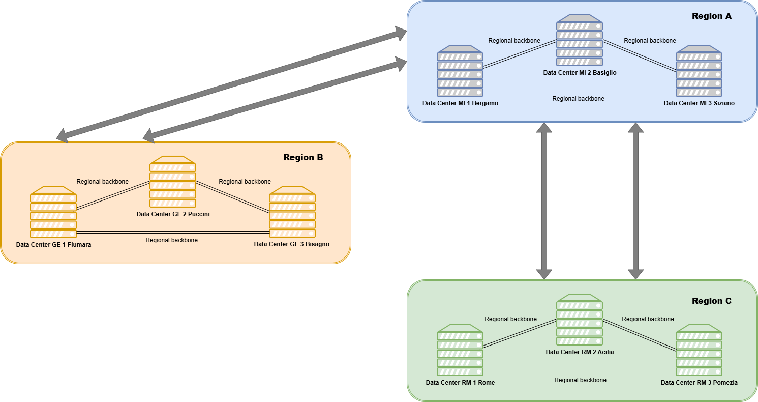 The three Availability Zones are interconnected via a dedicated regional backbone, which guarantees complete redundancy, negligible latency, and priority connectivity, logically characterizing the Regions as a single virtual Data Center (Software Defined Data Center).