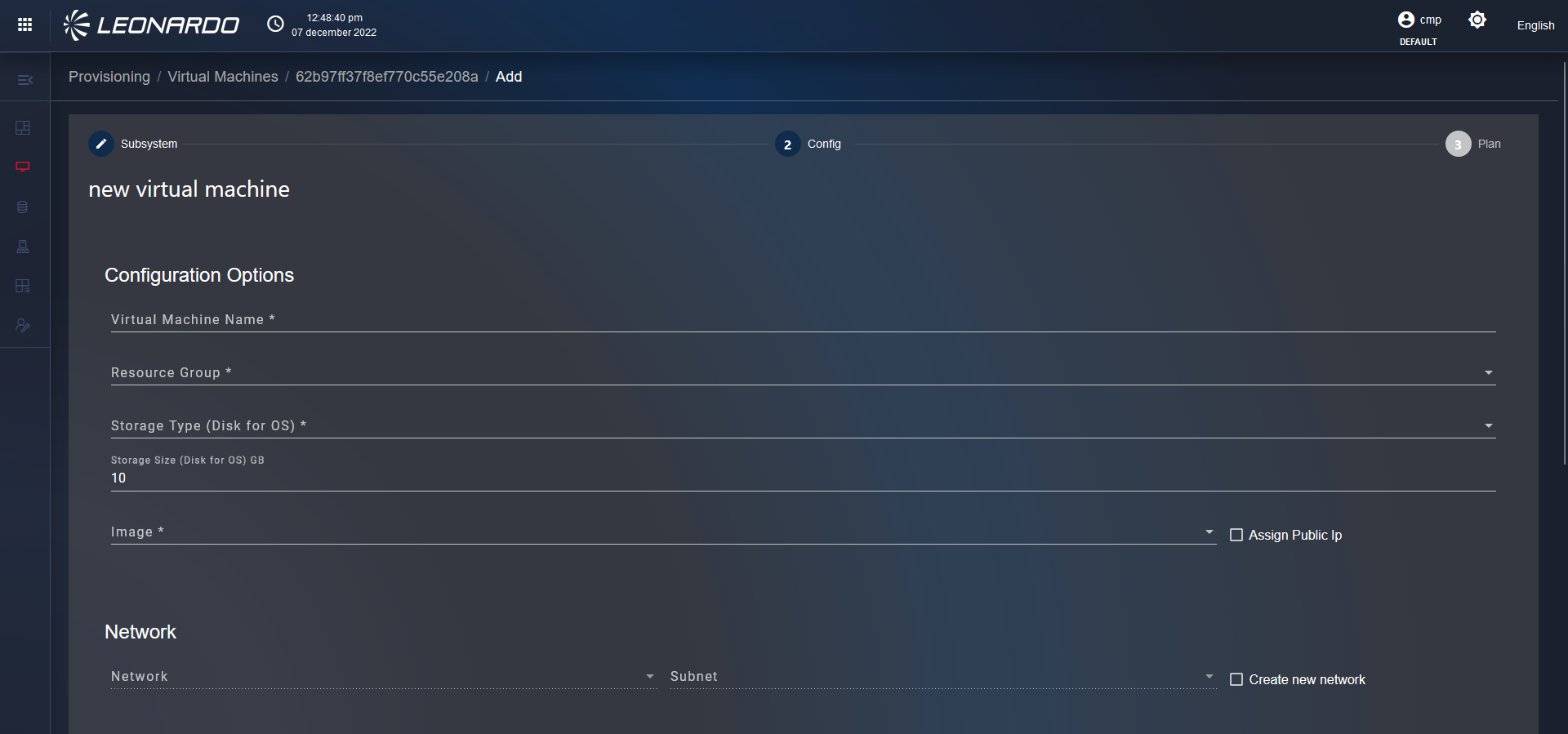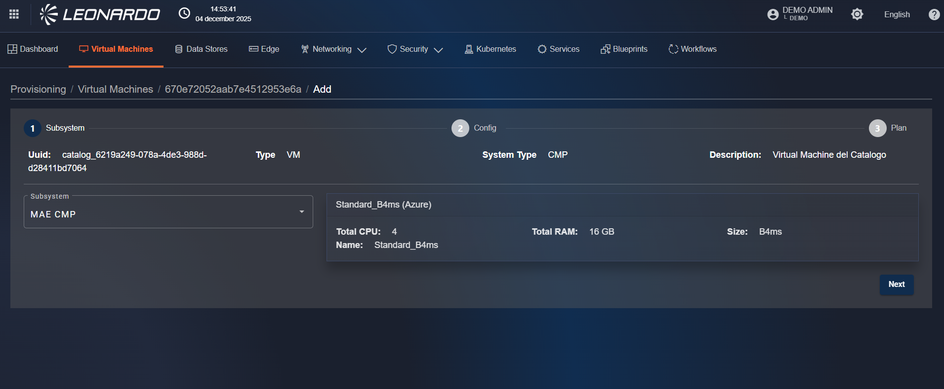 To start provisioning a resource, click on the corresponding row to view the page containing step 1 of provisioning creation. In this step, it is necessary to select, using the dropdown on the left, the "target" subsystem where the resources are to be provisioned. Once selected, an information mirror will be displayed on the right indicating the characteristics of the resource that will be provisioned. To continue, click the "Next" button at the bottom right to go to step 2 "Config" page.