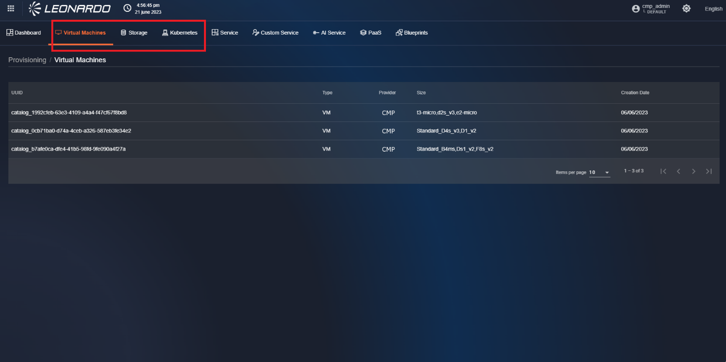 Using the tabs in the console's provisioning functionality, you can view lists of provisionable resources, such as Virtual Machines, Storage, and Kubernetes.
