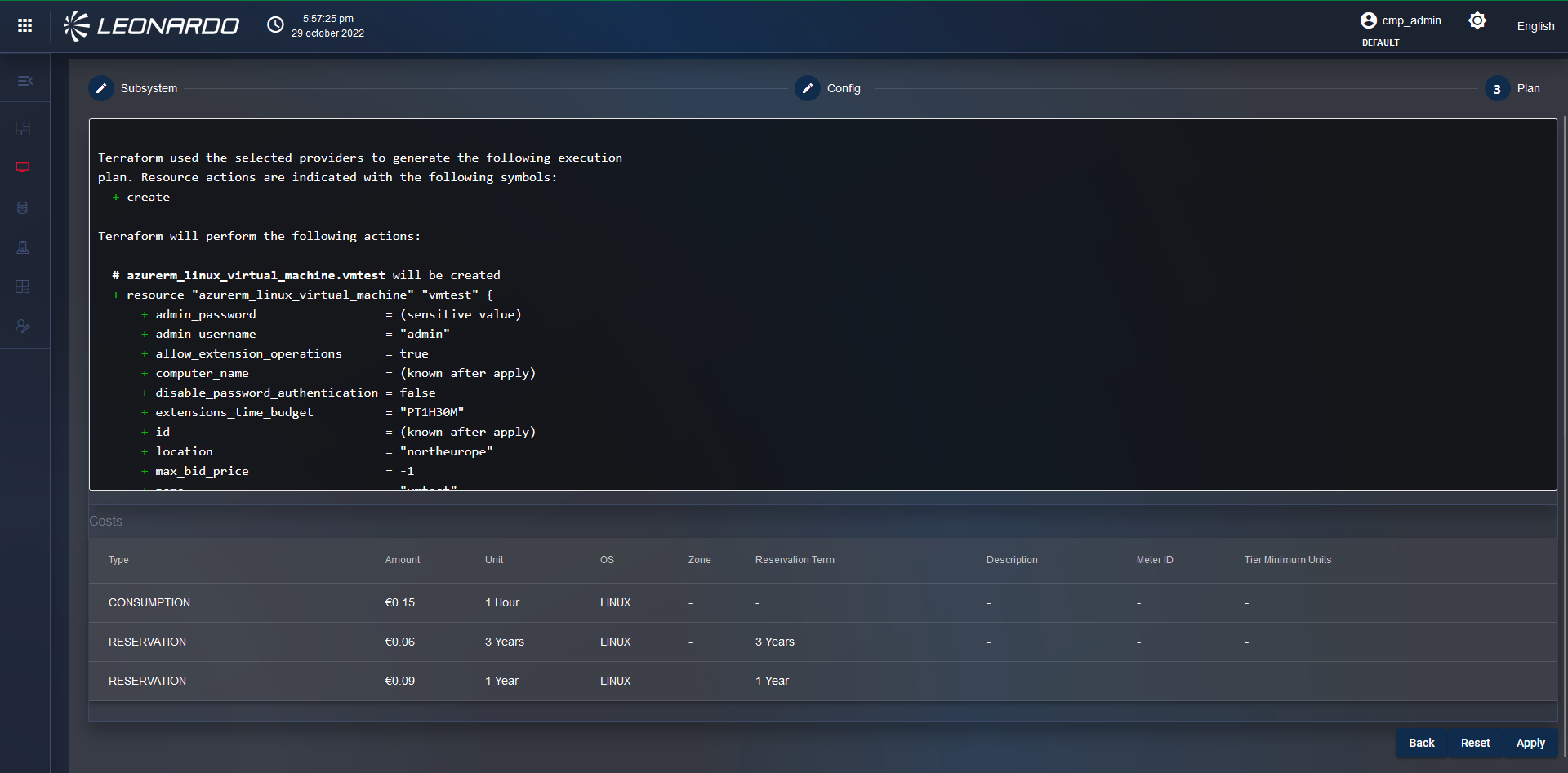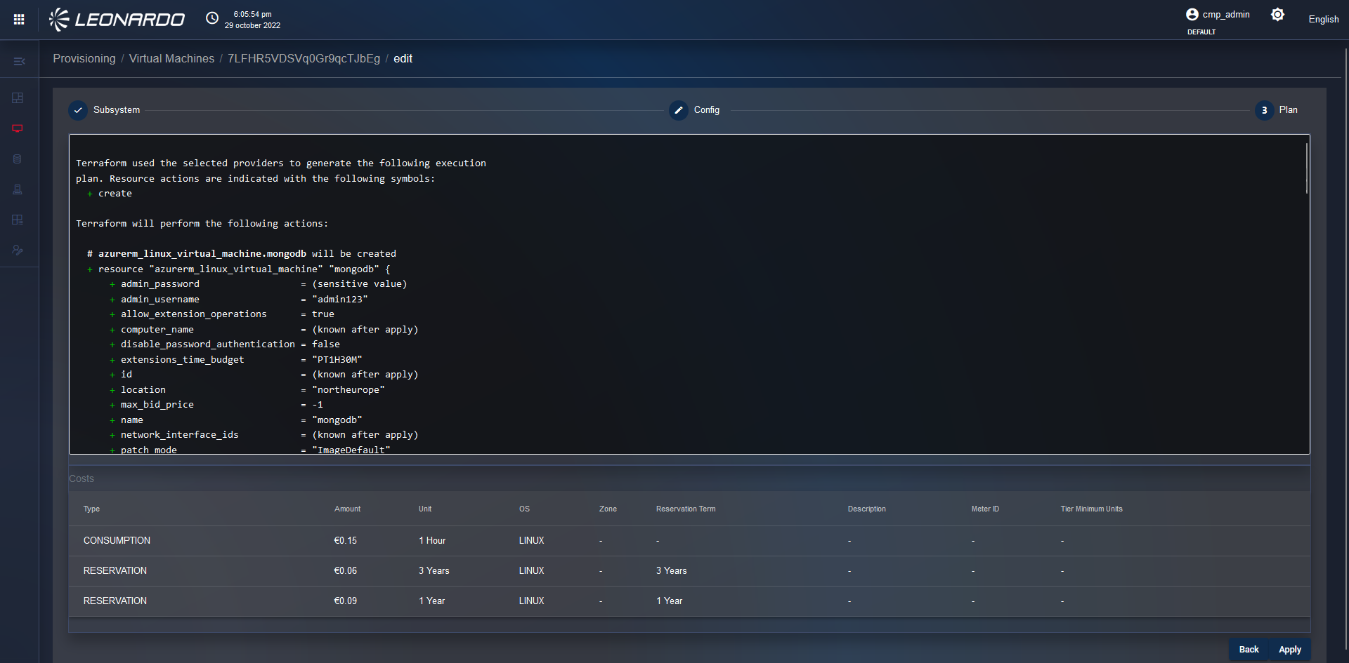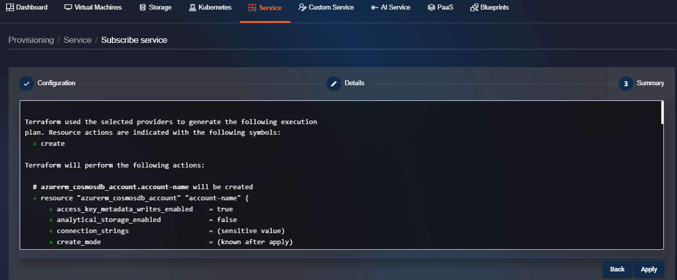 After clicking the "Submit" button, the user is redirected to the "Plan" page of step 3 where we can view the provisioning plan sent by Terraform, which indicates all the parameters of the resources that will be configured, and at the bottom, there is a list with a cost perspective.