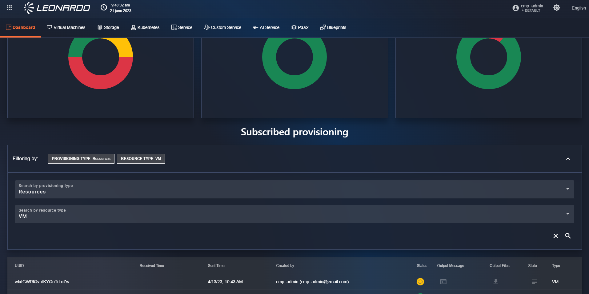 The dashboard page will open with the list of all subscribed services and their relative statuses. Specifically, the newly provisioned service will have a "Running" status in yellow, and subsequently, depending on the result, the status will also be updated to "Completed" in green or "Error" in red.
