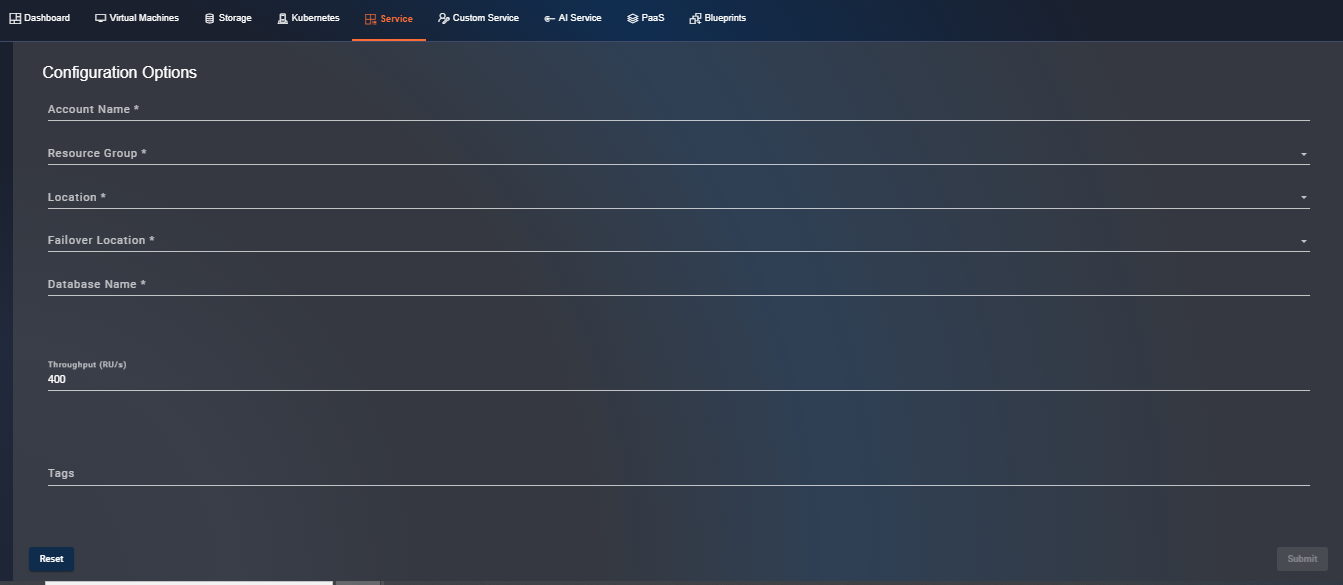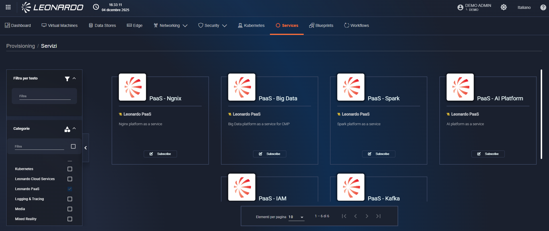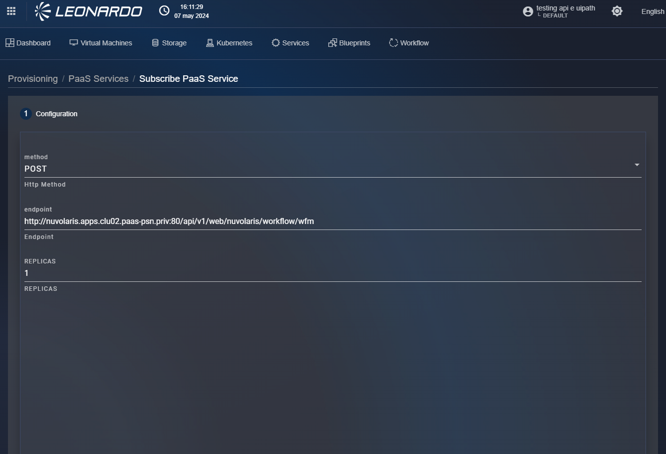 Click the "Subscribe" button corresponding to a "PaaS" service. The user will be redirected to step 1 of the service creation page where it will be necessary to fill out the form with the specific configuration parameters of the selected service.
