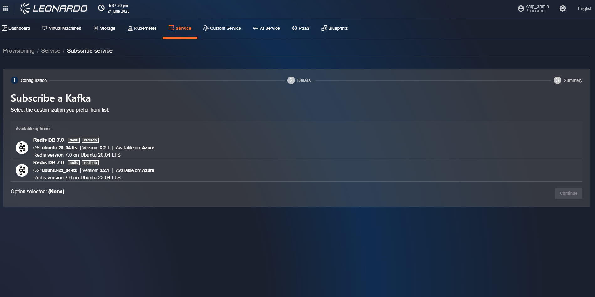 Select a software version and press the "Continue" button; the user is redirected to step 2 of service provisioning.