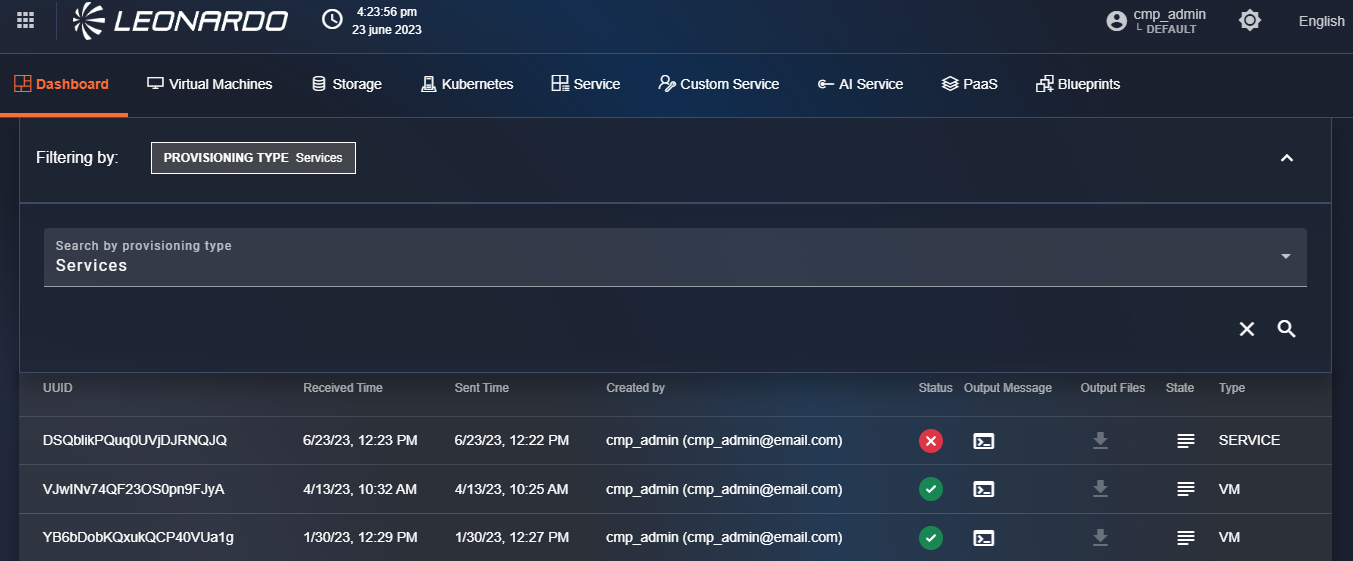 Specifically, the newly provisioned service will have a "Running" status in yellow, and subsequently, depending on the result, the status will also be updated to "Completed" in green or "Error" in red.