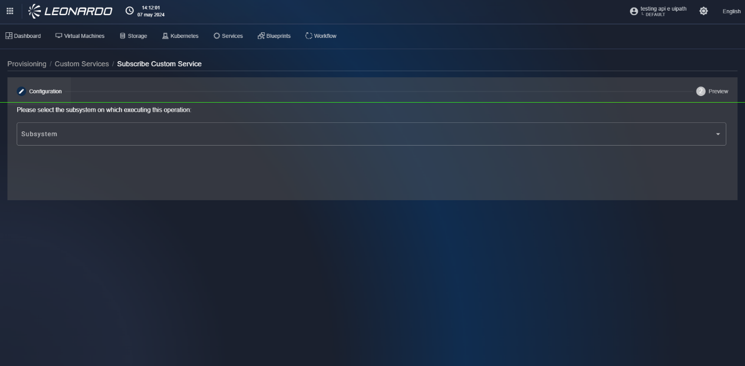 Click the "Subscribe" button corresponding to a "custom" service. The user will be redirected to step 1 of the service creation page where the subsystem can be selected, in which to perform the provisioning, from the dropdown in the center of the page.