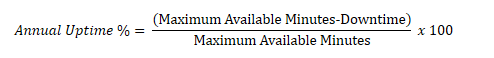 The Uptime Percentage is calculated as Maximum Available Minutes less Downtime divided by Maximum Available Minutes, where: